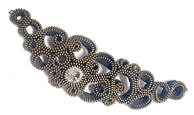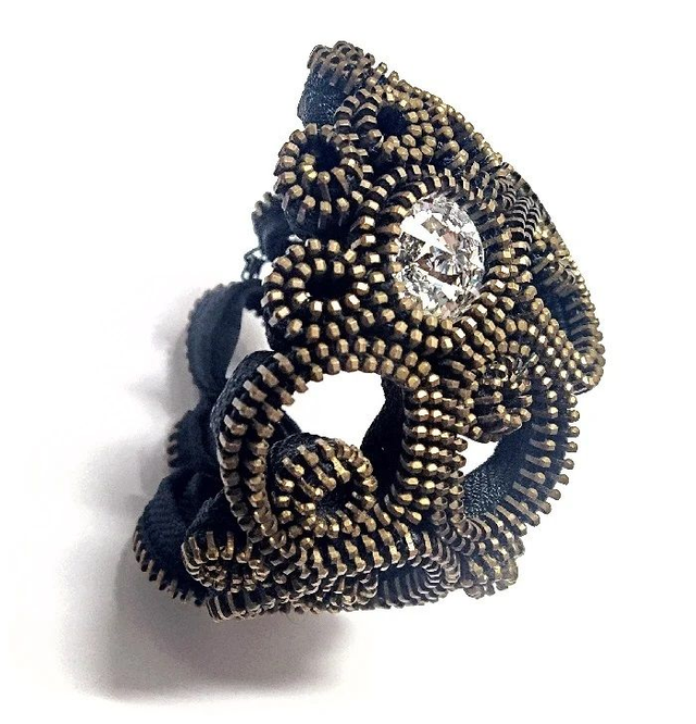 Bracciale Bangle strutturato, interamente cucito a mano, realizzato artigianalmente con cerniera lampo e cristallo Swarovski.