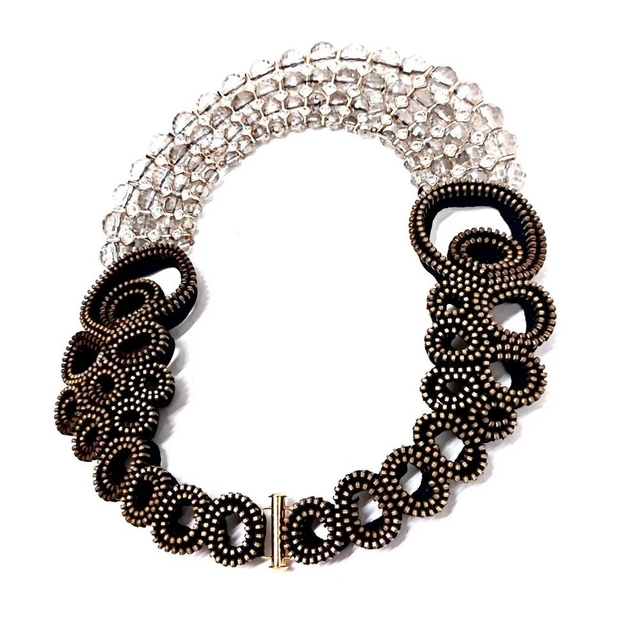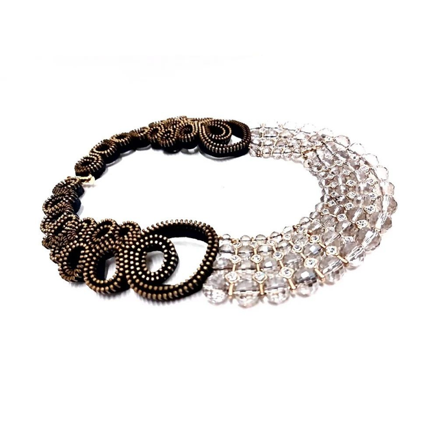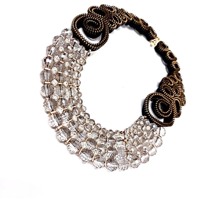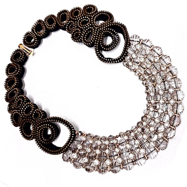 PEZZO UNICO: Collana strutturata, interamente cucita a mano, realizzata artigianalmente con cerniera lampo e cristalli.