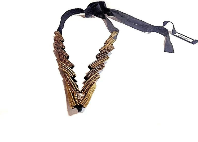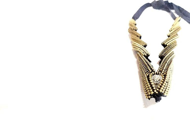 PEZZO UNICO: Collana strutturata, interamente cucita a mano, realizzata artigianalmente con cerniera lampo, cristallo Swarovski e tessuto.